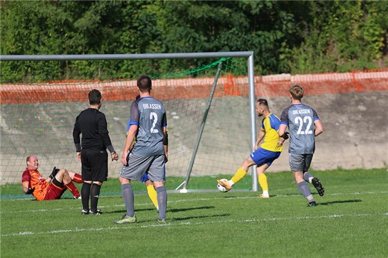 Im hart umkämpften Kellerkrimi zwischen dem ASN Pfeil-Phönix und dem TV Glaishammer besorgte Gäste-Akteur Nicolae Neaga (in gelb) in dieser Szene die zwischenzeitliche 2:0-Führung im Elfmeter-Nachschuss. Weil die Assen durch Routinier Kubecek lediglich zum späten 1:2-Endstand kamen, durfte der TVG den ersten Saisonsieg bejubeln und sprang über den Strich, unter dem sich die Bauer-Truppe nun befindet.