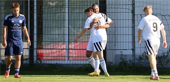 SVW-Spielertrainer Cihan Kiymaz (in weiß) steuerte wie Mitspieler Lukas Bieber einen Doppelpack zum 4:2-Heimsieg gegen den TSV Maccabi bei, der gegen den neuen Spitzenreiter nach zwei Siegen wieder leer ausging.