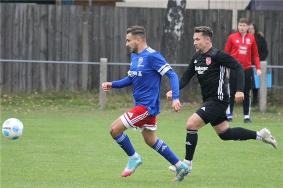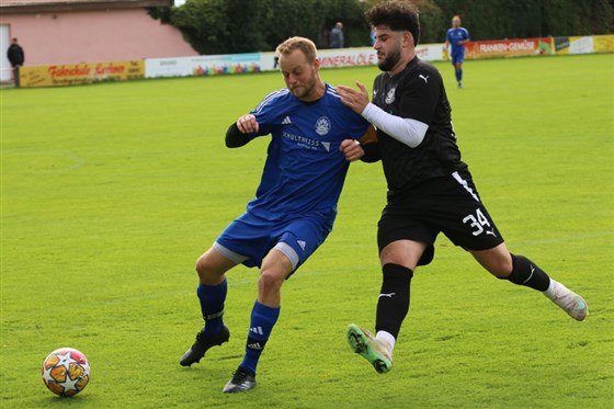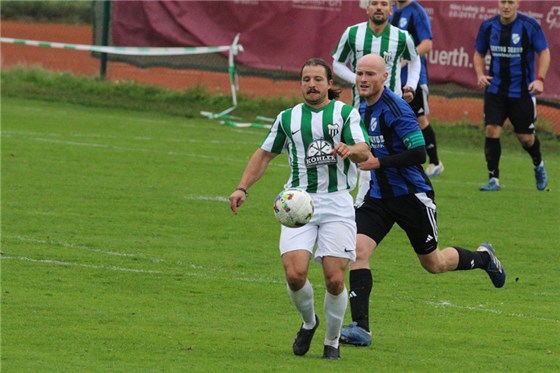 Boxdorfs Kapitän Oliver Karl (in blau) bescherte seinem ASC Boxdorf spät noch einen Zähler im Gastspiel beim Spitzenreiter SV Poppenreuth um Daniel Uttinger (1:1).