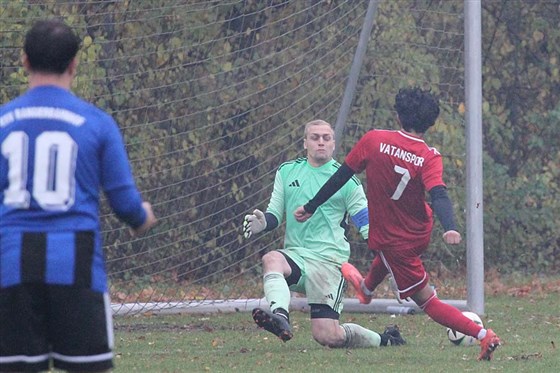 Dagegen ließ es Verfolger Vatanspor (in rot) gegen Kellerkind ESV Rangierbahnhof richtig krachen und machte es beim 10:0-Kantersieg sogar zweistellig. Hier schob Vatans Bhatti (Nr.7) zum zwischenzeitlichen 7:0 ein.