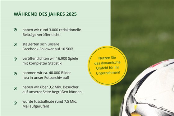 Die Effekte einer aktiven, stark frequentierten, regionalen Plattform können wir an Sie weitergeben – buchen Sie Werbeflächen auf unseren Seiten und sprechen Sie direkt Ihre Zielgruppe an – die Leser von fussballn.de!