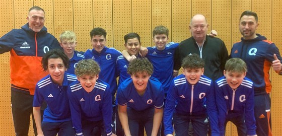 Bei den U13-Junioren gewann die SG Quelle Fürth die Hallenkreismeisterschaft 2025. Jugendgruppenspielleiter Uwe Richmann (stehend, Zweiter von rechts) freute sich mit den Trainern Zafer Sivetoglu (l.) und Ferit Uzun (r.).