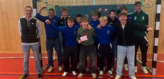 Bei den U15-Junioren gewann die TuS Feuchtwangen die Hallenkreismeisterschaft 2025. Jugendgruppenspielleiter Martin Beck (stehend links) gratulierte dem Siegerteam.