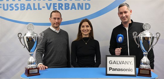 Auslosung Bayerische Hallenmeisterschaften der U13- und U15-Junioren: (v.l.) Verbands-Jugendleiter Florian Weißmann, Anja Rohner (Head Of Marketing Galvany Panasonic) und Moderator Sebastian Dirschl.