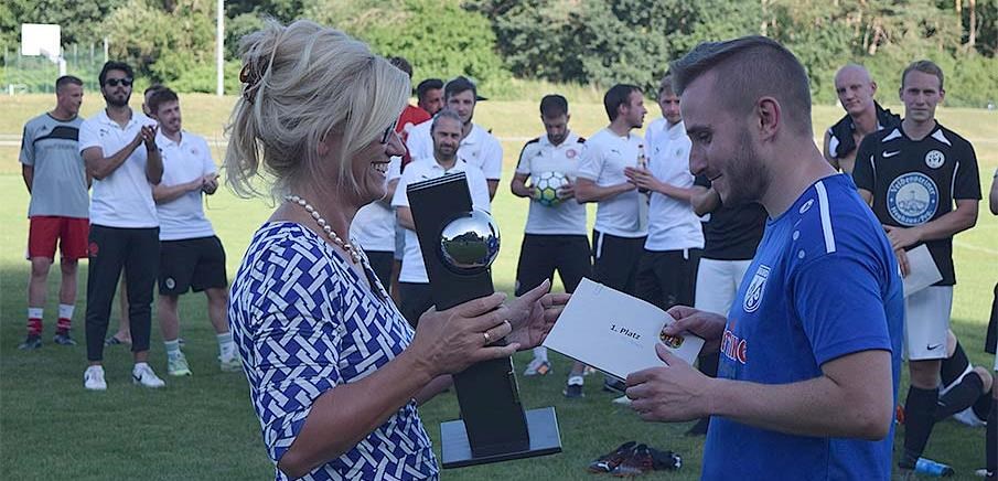 Der TSV Brand sicherte sich im letzten Jahr den Sieg. Die Übergabe des Pokals mit Bürgermeisterin Ilse Dölle.