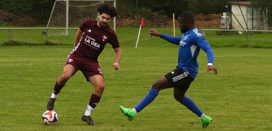 Kapitän und Torschütze Nando Pfeiffer (Nr. 10, in rot) umkurvten den SV Laufamholz erfolgreich mit 2:0 und durften nach drei Pleiten in Folge wieder über Zählbares jubeln. Der SVL muss sich hingegen schleunigst stabilisieren, um weiter über dem Strich zu bleiben.