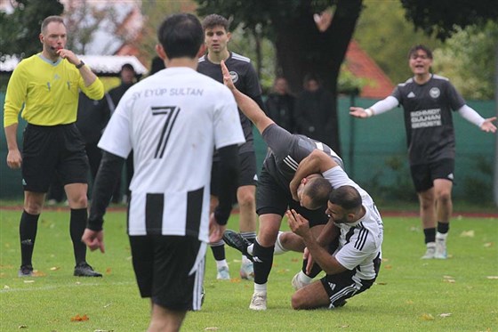 Auch wenn die Kreisliga Nürnberg die DJK Eibach (in grau) zwischenzeitlich ganz schön im Schwitzkasten hatte, fand sich die DJK als Aufsteiger in der Folge immer besser in der neuen Umgebung zurecht und schob sich zum Ende der Hinrunde aus dem Tabellenkeller.
