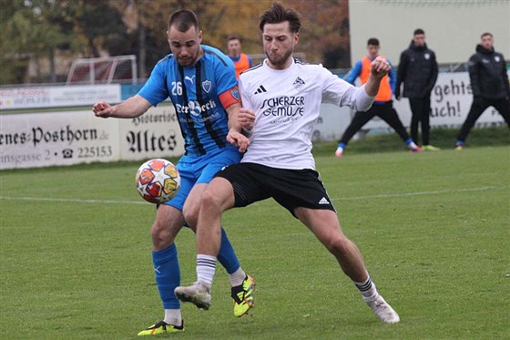 Simon Kreisel (r.) und der TSV Buch boten dem favorisierten FSV Erlangen-Bruck um Kapitän Anton Gnerlich über weite Strecken Paroli, dennoch nahmen am Ende die Gäste durch einen 2:1-Arbeitssieg die drei Punkte mit auf die Heimreise.