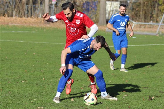 Mehr Mühe hatten dagegen Berkay Gök und Vatanspor Nürnberg (in rot), die sich am Ende aber doch mit 1:0 gegen den wehrhaften FC Bosna (in blau) durchsetzen konnten.