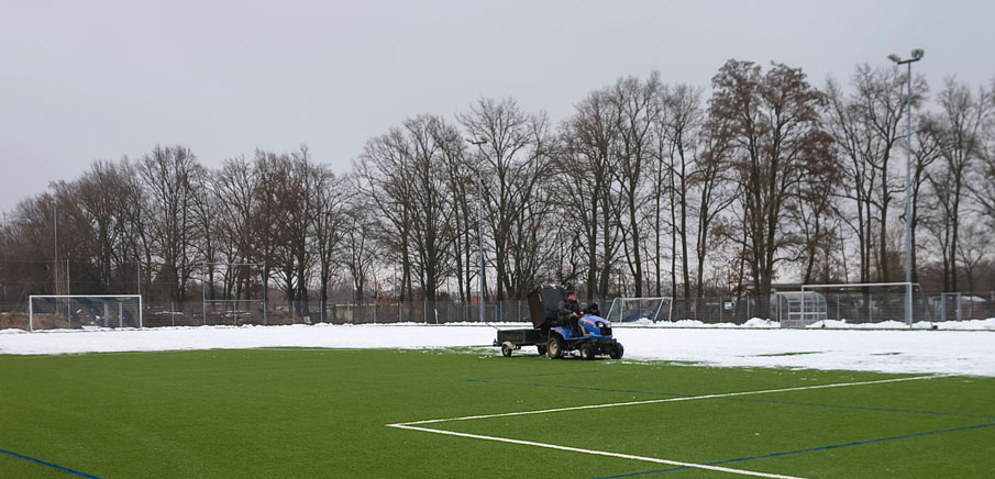 Bei der SG Quelle Fürth lag schon am Donnerstag dank fleißiger Räumarbeiten kaum noch Schnee am Kunstrasenplatz, wo ab Samstag wieder gespielt werden soll.