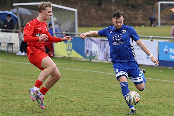 Der SV Schwaig (in blau, hier gegen den Baiersdorfer SV) um Niclas Hamann musste sich am Freitagabend bereits dem Laufer SV geschlagen geben. Nach der 1:3-Heimniederlage steckt der SVS weiter tief im Abstiegskampf der Bezirksliga Nord.
