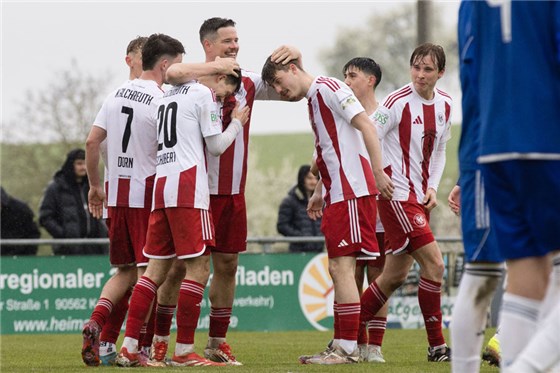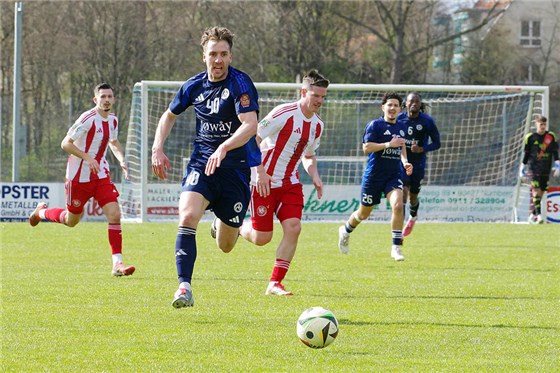 Der SC Germania (in blau, hier gegen den 1. FC Kalchreuth) um Torschütze Alexander Sekita feierte im Gastspiel beim FC Ottensoos einen deutlichen 6:0-Kantersieg und holte damit drei wichtige Zähler im Abstiegskampf gegen einen direkten Konkurrenten.