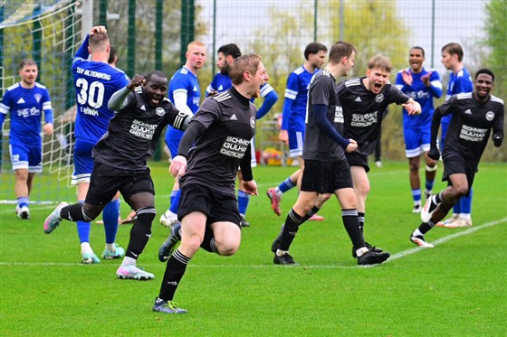 Auch die DJK Eibach (in Schwarz) machte einen weiteren großen Schritt in Richtung Klassenerhalt: Die Eibacher beendeten den starken Lauf des TSV Altenberg (in blau) und drehten das Spiel spät zu ihren Gunsten. Johannes Hofmann (m.) besorgte den umjubelten Ausgleich und leitete so die Wende beim 2:1-Auswärtssieg seiner Mannschaft ein.