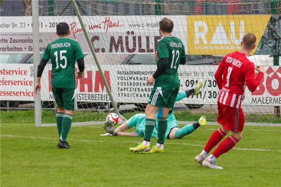 Drin ist das Ding! Buchs Dreifachtorschütze Mario Gsänger (in rot) dreht nach einem Treffer beim 5:1-Auswärtssieg im Derby bei den SF Großgründlach jubelnd ab.