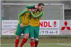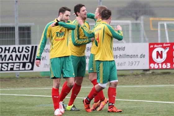 Lukas Münzel (2.v.li.) wird von seinen Mannschaftskameraden nach seinem entscheidenden Treffer zum 1:0-Sieg über Naisa gefeiert. Es war sein fünftes Saisontor und fiel in der 44. Minute nach einem Abstimmungsfehler in der Abwehr des ASV Naisa.