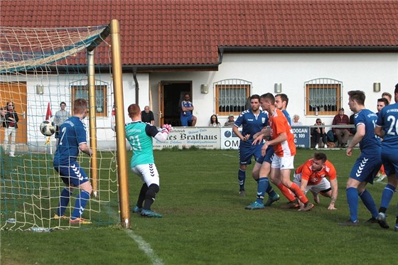 Später Ausgleich: der SV Wacker (in orange) kam hier durch den zweiten Treffer von Kevin Ott (kniend) zu einem späten 2:2-Remis gegen den SV Hagenbüchach. Für den SVH bedeutet die Punkteteilung einen Rückschlag im Kampf um den Aufstieg, für Wacker könnte der eine Zähler in der Endabrechnung noch einmal Gold wert sein.
