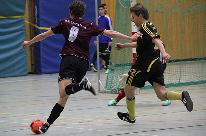 Da soll noch einer sagen, Futsal sei langweilig! Aus der Gruppe D1 war im Vorfeld wohl kaum jener Unterhaltungswert zu vermuten, den die Mannschaften am späten Sonntagabend in der Halle am Berliner Platz dann boten. Für die erste kleinere Überraschung sorgte gleich im Auftaktspiel der SSV Elektra II Hellas, der angeführt vom überragenden Pashalis Georgiadis einen 2:1-Sieg über den SV 73 Süd landete. Dabei bewies Georgiadis neben seinen technischen Fähigkeiten auch eine exzellente Schusstechnik und jagte den entscheidenden Zehnmeter mit vollem Tempo in den Torwinkel - besser geht es nicht! Im Anschluss duellierten sich die beiden vermeintlichen Underdogs. Dabei hatte die DJK Sparta Noris, angetrieben von Mario Ramser, das größere Stehvermögen gegenüber der SG Puschendorf/Tuchenbach und siegte 3:0.