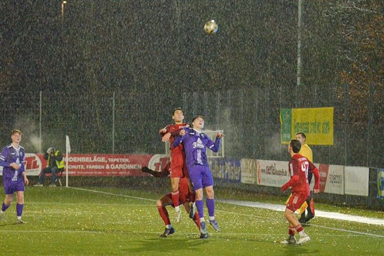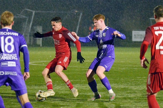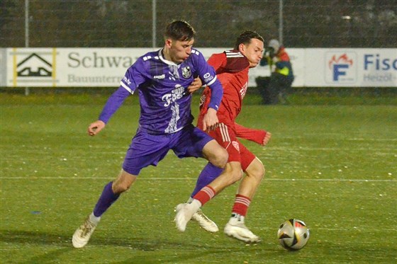 Kalt und nass war es am Dienstagabend, als der FC Eintracht Bamberg bei der DJK Don Bosco auf den TSV Kornburg traf. Und doch sorgten die Akteure in Violett auf dem Platz dafür, dass es den meisten der rund 260 Zuschauer schnell warm ums Herz werden sollte. Die Gastgeber drückten die Gäste in den ersten Minuten nämlich früh zurück in die eigene Hälfte und erarbeiteten sich damit mehrere schnelle Ballgewinne. Zeitig erzielten die Domreiter dann auch schon den ersten Treffer des Abends: Nach einem viel zu kurzen Rückpass von Albion Januzi in Richtung seines Torhüters Thorben Hochmuth, schnappte sich Luca Ljevsic das Leder, um die Gastgeber mit der ersten Torchance des Spiels direkt in Front zu schießen (8.).