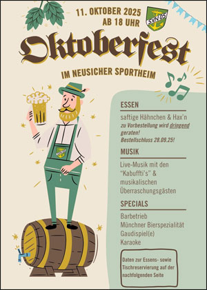 Der SV Neuses 05 lädt herzlich zum Oktoberfest am 11.10. ins Neuseser Sportheim ein.