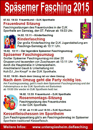 Auftakt macht die Faschingssitzung am Samstag, den 07. Februar in der DJK Sporthalle in Unterspiesheim. Am Faschingswochenende geht es dann rund um das DJK Sportgelände hoch her. Höhepunkt ist wie in jedem Jahr der große Späsemer Faschingsumzug mit mehr als 20 Wagen und Gruppen und tausenden Zuschauern.