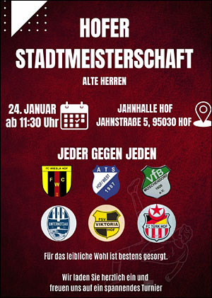 Der FC Türk Hof lädt recht Herzlich zur diesjährigen Stadtmeisterschaft der Altherren in die Jahnturnhalle ein. Ab 11:30 Uhr kreuzen die Teams des FC Wiesla Hof, des ATS Hof West, des VfB Moschendorf, des FSV Unterkotzau, des FSV Viktoria Hof und dem gastgebenden FC Türk Hof im Modus "Jeder gegen Jeden" die Klingen. Für das leibliche Wohl ist während der gesamten Veranstaltung bestens gesorgt.