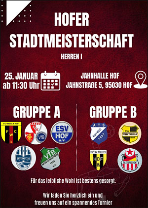 Der FC Türk Hof lädt recht Herzlich zur diesjährigen Stadtmeisterschaft der Herren in die Jahnturnhalle ein. Ab 11:30 Uhr kreuzen die Teams des Hofer Stadtgebietes die Klingen. Es geht in zwei gruppen um die Teilnahme an den Halbfinalpartien. Für das leibliche Wohl ist während der gesamten Veranstaltung bestens gesorgt.