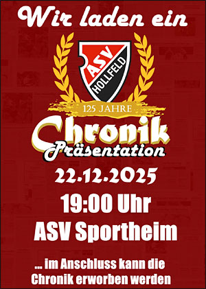 Am 22.12.2025 um 19.00 Uhr wird im ASV-Sportheim (Kulmbacher Straße 24, 96142 Hollfeld) die Vereinschronik zum 125-jährigen Jubiläum des ASV Hollfeld mit einem Rahmenprogramm veröffentlicht.