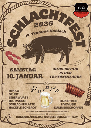 Der FC Teutonia Hasslach lädt euch zum alljährlichen Schlachtfest ein. Bei traditionellen Speisen und diversen Kaltgetränken wird es in unserer Laube wieder zünftig. Barbetrieb und Livemusik, laden zum verweilen ein.