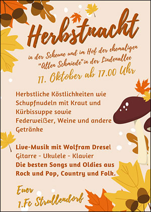 Der FCS veranstaltet eine "Herbstnacht" in der ehemaligen Schmiede in der Lindenallee 15 in Strullendorf. Es gibt Live-Musik mit Wolfram Dresel. Er spielt Gitarre, Ukulele und Klavier. Alles echt und live gespielt. Die besten Songs und Oldies aus Rock und Pop, Country und Folk.