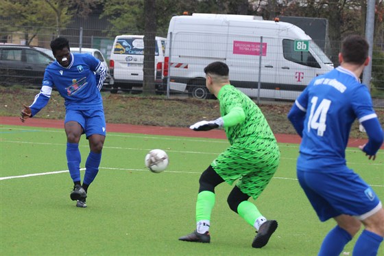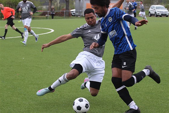 Dominik Knespel (in blau-schwarz) und der SC Germania II bekamen bei der SGV Nürnberg-Fürth 1883 III Merl Bau (in grau) derweil reichlich Gegenwehr, konnten sich am Ende aber dank eines Carpenter-Dreierpacks mit 4:3 durchsetzen. Damit bleiben die Germanen weiterhin im Aufstiegsrennen vertreten.