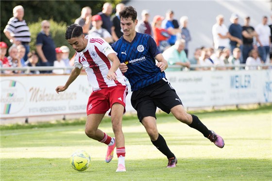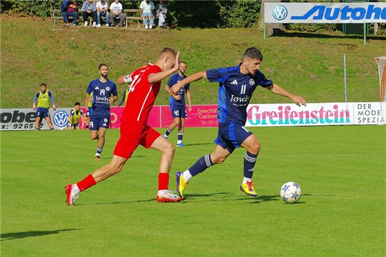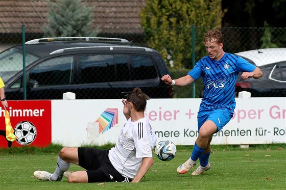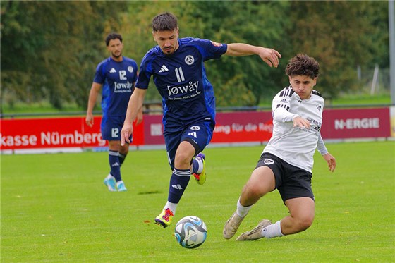 SGV-Angreifer Dominik Healy (in blau) traf im Heimspiel gegen den SV Schwaig zum verdienten 4:1-Endstand. Der SV Schwaig um Nico Steinbinder hatte zwar früh geführt, musste sich letztlich aber doch geschlagen geben.