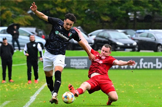 Der 1. FC Schnaittach (in rot, hier gegen den SC Germania) um Kapitän und Doppeltorschütze Timo Müller gewann das Kellerduell gegen den SV Tennenlohe dank eines späten Elfmeters mit 3:2 und holte wichtige Zähler im Kampf um den Klassenerhalt.