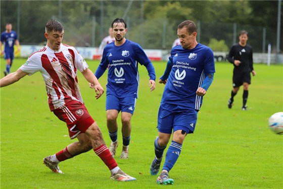 Der 1. FCHerzogenaurach (in blau, hier gegen den 1. FC Kalchreuth) um Tom Richter fuhr im Heimspiel gegen den Laufer SV einen souveränen und ungefährdeten 5:1-Heimsieg ein und bleibt schärfster Verfolger von Spitzenreiter Kalchreuth.