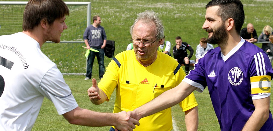 Roland Fertsch (re.) im Gespann mit Stefan Müller (li.) vom SVM Untermerzbach und Schiedsrichter Daniel Seifert (Mi.) vom TSV Pfaffendorf.