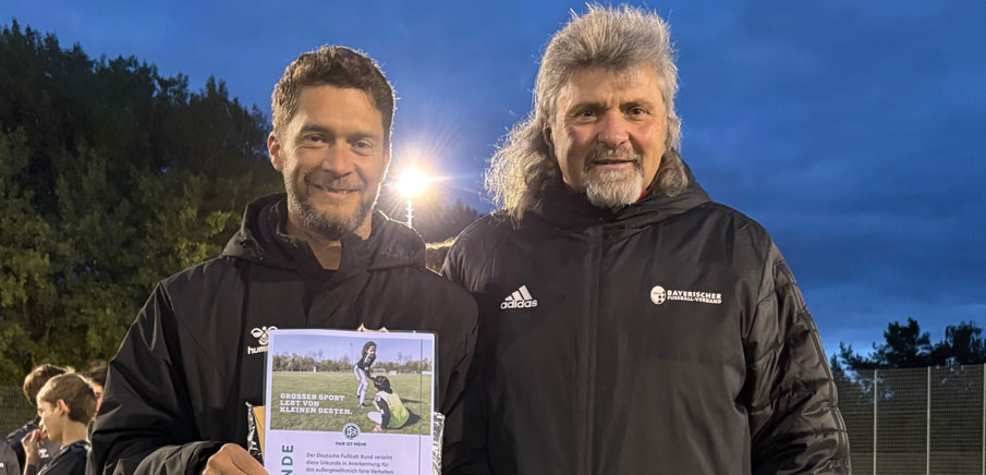 Für sein vorbildliches Verhalten wurde U15-Trainer Frank Mauer vom SV Poppenreuth im Rahmen der DFB- und BFV-Aktion „Fair ist mehr“ ausgezeichnet. Ebenso gab es die besondere Auszeichnung für Simon Berger, U17-Spieler der SG Mosbach/Breitenau, der Größe bewies und einen für ihn ausgesprochenen Elfmeter beim Schiri zurücknehmen ließ.