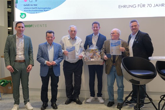 Ehrungen für 50 bzw. 70 Jahre als Schiri (von links): Moderator und VSA Tobias Baumann, BSO Siegmar Seiferlein, Hermann Schwab (70 Jahre SR), GSO Fabian Jürschik, Hermann Eger (50 Jahre SR), Kreisehrenamtsbeauftragter Jörg Salzer.