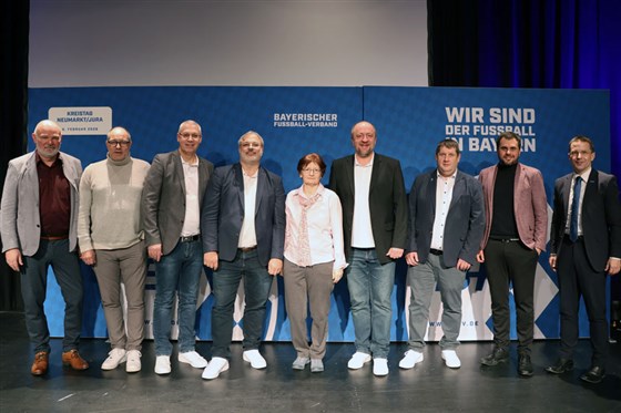 Der Kreis-Ausschuss im Kreis Neumarkt/Jura (v.l.): Uwe Mauckner (Bezirks-Vorsitzender Mittelfranken), Andreas Kienlein (Kreis-Jugendleiter), Klaus-Peter Rißbeck (Vorsitzender des Kreis-Sportgerichts), Gerald Bast (Kreis-Ehrenamtsbeauftragter), Karin Krapfenbauer (Kreis-Beauftragte für den Frauen- und Mädchenfußball), Michael Tittmann (Kreis-Vorsitzender), Markus Hutflesz (Kreis-Spielleiter), Michael Winkler (Kreis-Schiedsrichterobmann) und BFV-Präsident Christoph Kern.