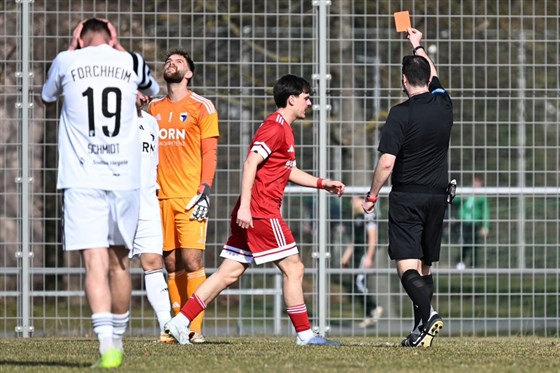 Forchheims Schlussmann Tom Bezold (in orange) sah bereits nach neun Minuten die Rote Karte.