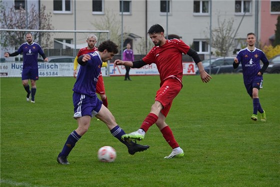 Die einzige Punkteteilung des Spieltages gab es im Zaun-Derby zwischen der DJK Falke (in lila) und dem TV Glaishammer zu notieren, wobei die Falken zunächst ihre 1:0-Führung aus der Hand gaben, um via Elfmeter-Doppelpack von Loh den zwischenzeitlichen 1:3-Rückstand noch egalisieren zu können.
