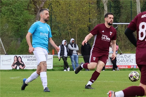 Im Verfolgerduell zwischen der DJK BFC und dem SV Wacker stellten die Gastgeber zwar die Offensivmaschinerie der Gäste um Spielertrainer Cihan Kiymaz (in blau) kalt, konnten jedoch durch das torlose Remis den eigenen Rückstand auf Platz zwei nicht verkürzen.