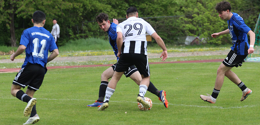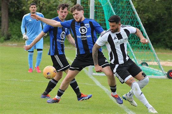 Im Tabellenkeller schöpfte der ESV Rangierbahnhof (in schwarz-blau) durch einen 2:0-Auswärtssieg bei Schlusslicht SV Eyüp Sultan (in schwarz-weiß) neue Hoffnung auf die Relegation. Steven Ziu (2.v.r.) stellte für seine Rangers früh die Weichen auf Sieg.
