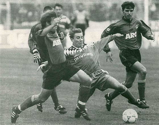 Bernd Fuchsbauer (mit dem langen Bein) war einst gefürchteter Torjäger der Quelle.